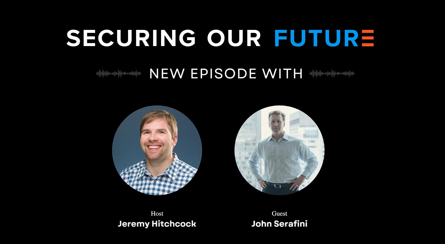 Look for a new episode of Securing the Future Podcasts wherever you listen. In our latest episode, we have guest John Serafini sit down with General Partner Jeremy Hitchcock for an engaging conversation where John discusses the dual-use space and outlines ways to optimize the industry for a more secure future.