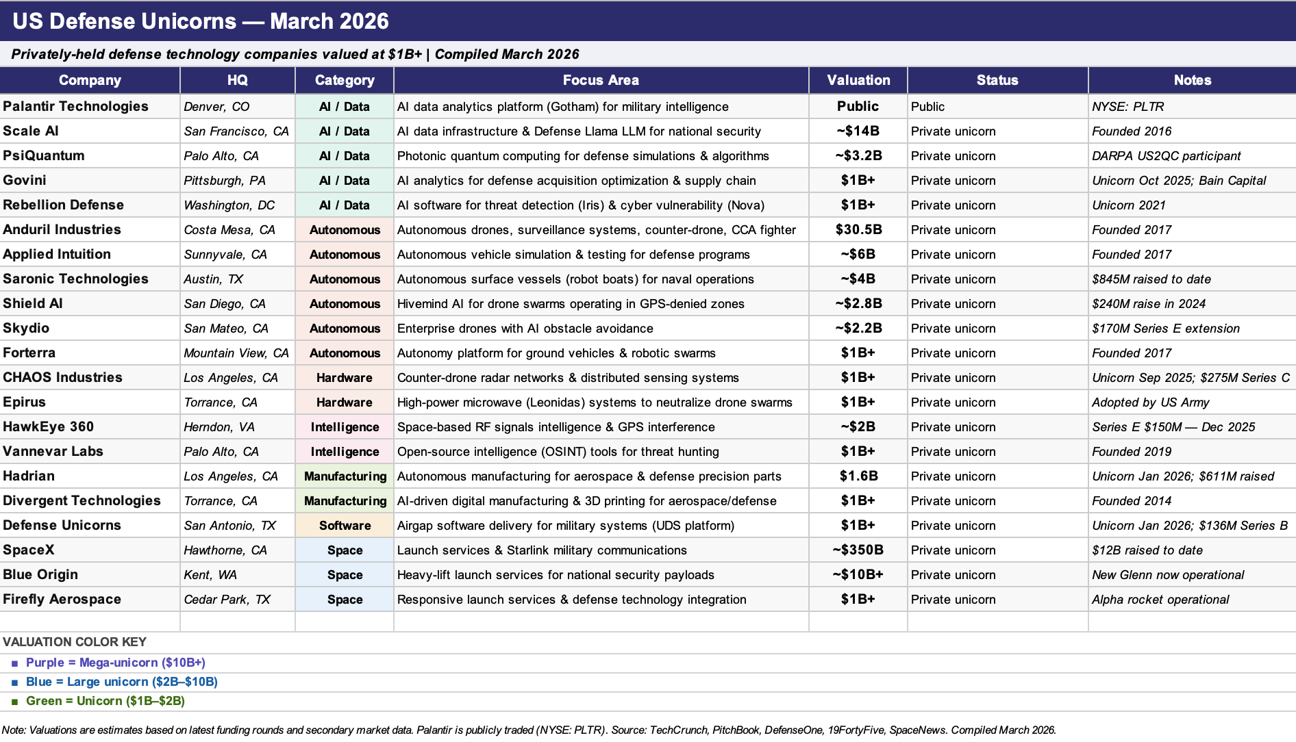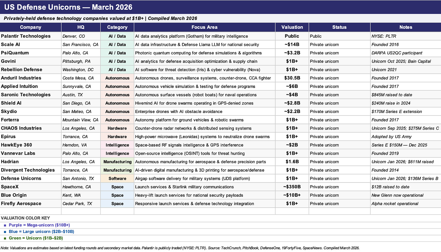For early stage investors, this landscape is more than a scoreboard, it’s a signal map. These unicorns show where real demand exists inside the Department of War and where budgets are actually getting deployed. Just as importantly, they represent the next generation of acquirers. Tracking what these companies prioritize, whether it’s AI infrastructure, edge compute, autonomy, or manufacturing, offers a forward looking view into M&A pathways and platform consolidation.