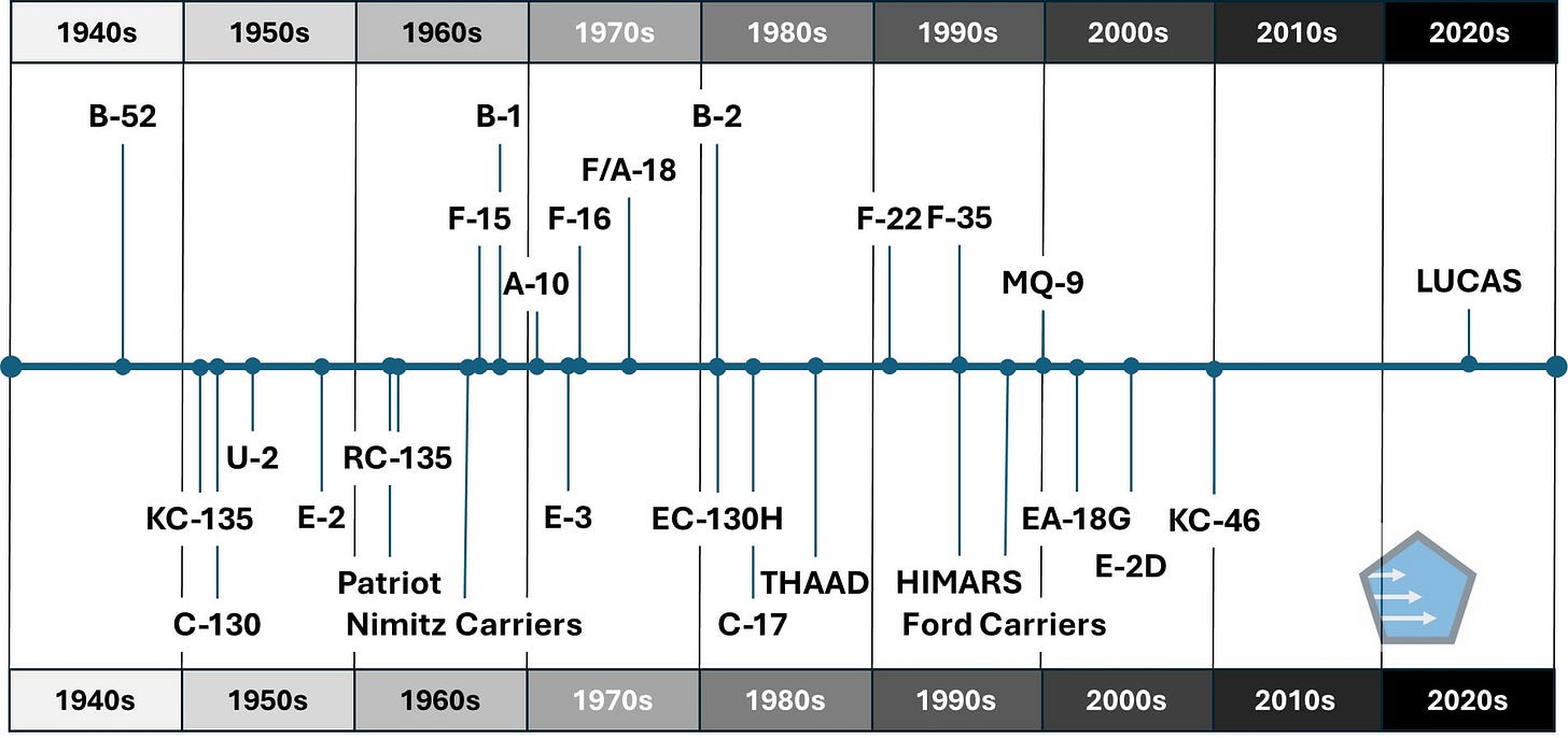 What’s changing now is the shift toward speed as a core advantage. Autonomous systems, software defined platforms, and modular architectures are enabling faster deployment and continuous upgrades. The future isn’t about replacing every legacy system overnight, it’s about building a force that can adapt in real time, with innovation cycles measured in months, not decades (Timeline by Pete Modigliani).