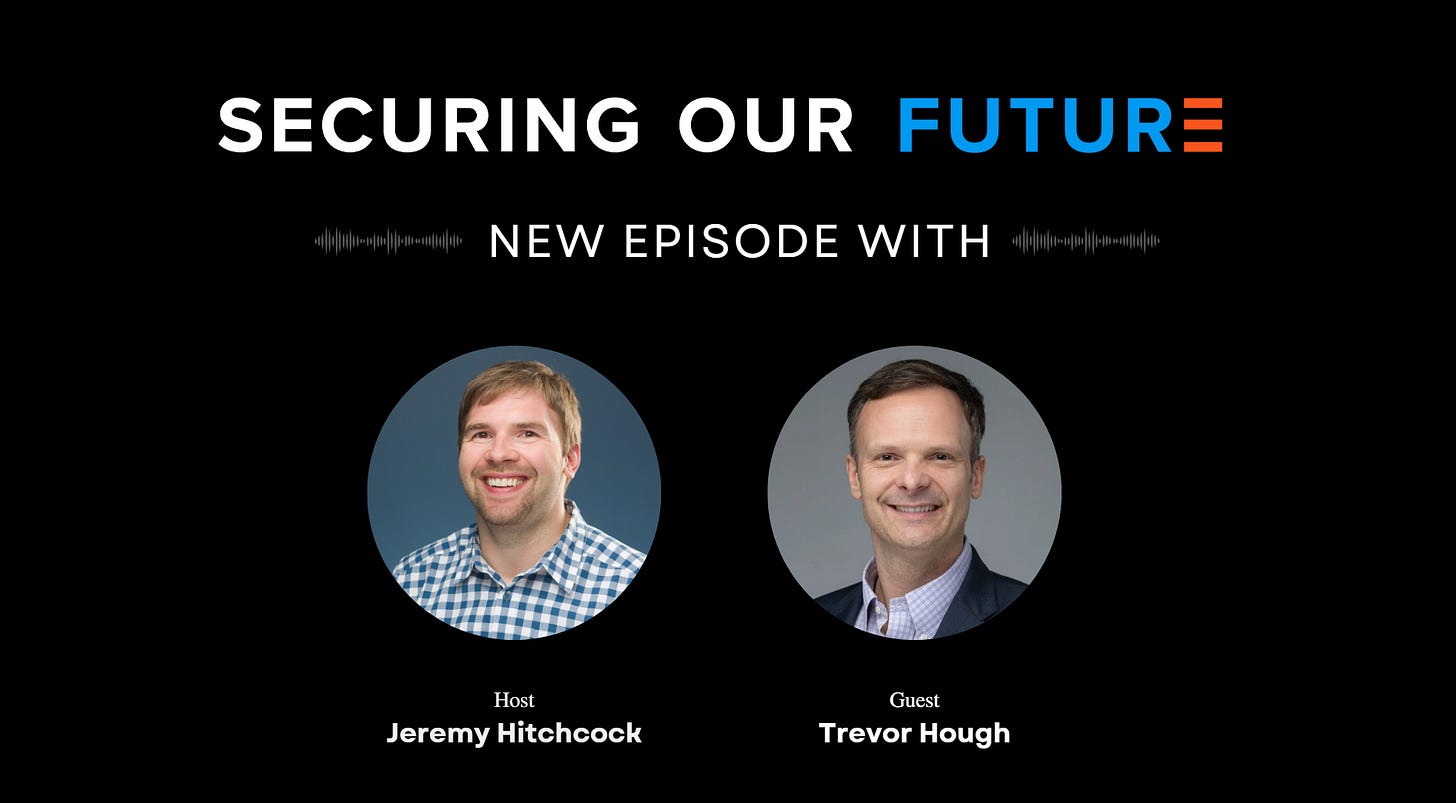 In our latest Securing Our Future podcast, host Jeremy Hitchcock sits down with Trevor Hough, the Owner of The ADK Group, an advisory firm focused on bridging the gap between industry, national security, and investors and helping companies scale up their business while solving vital national security challenges.